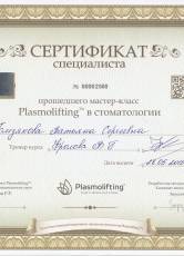 2015 г. Сертификат специалиста прошедшего мастер-класс Plasmolifting в стоматологии