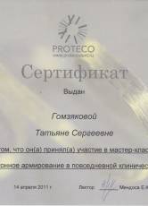 2011 г. Сертификат PROTECO участие в мастер-классе «Стекловолоконное армирование в повседневной клинической практике»