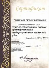 2016 г. Сертификат обучение по курсу «Лечение осложненного кариеса»