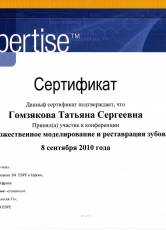 2010 г. Сертификат Espertise участие в конференции «Художественное моделирование и реставрация зубов»