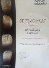 2022 Сертификат от DENTAL EDUCATION о прохождение обучение на практическом курсе “Фронтальные реставрации”