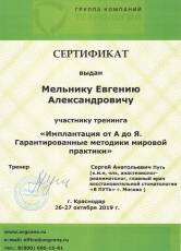 2019 г. Сертификат группы компаний "ТЕХНОЛОГИЯ" - Имплантация от А до Я. Гарантированные методики мировой практики"