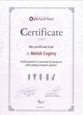 2015 г. Certificate participated in a seminar & hands on with paltop implant system