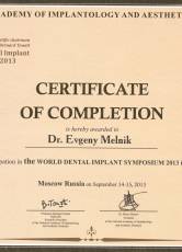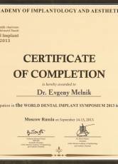 2013 г. CERTIFICATE OF COMPLETION the world dental implant symposium in Moscow