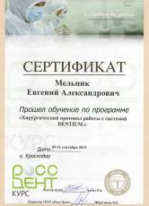 2013 г. Сертификат прошел обучение Хирургический протокол работы с системой DENTIUM
