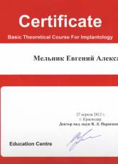 2012 г. Certificate Basic Theoretical Course For Implantology