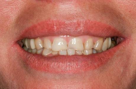 Пациентка обратилась с жалобами на стирание зубов, вызванное бруксизмом (скрежетом зубов), отсутствие жевательных зубов, неудовлетворительную эстетику улыбки и невозможность пережевывания пищи.